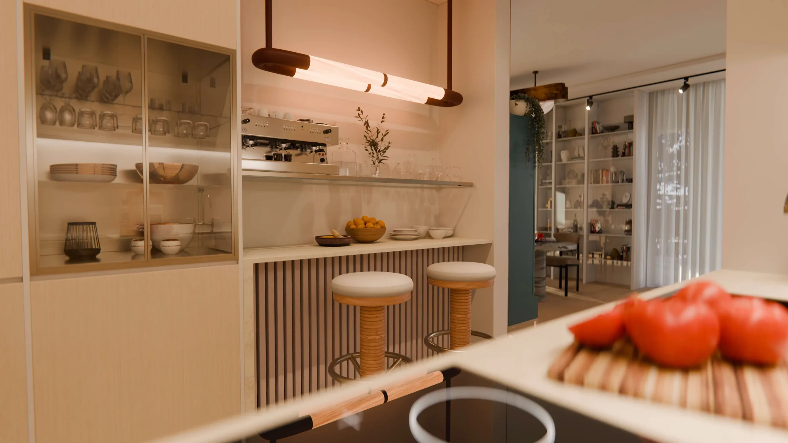 With panelized appliances, quartz countertops,and open shelving designed for both function and form.